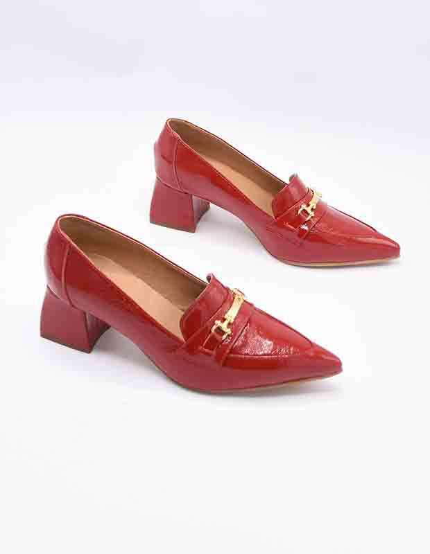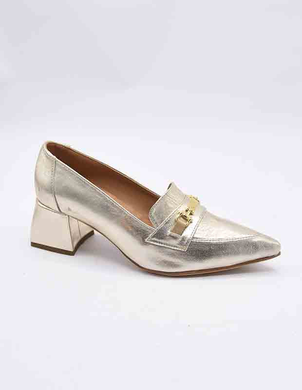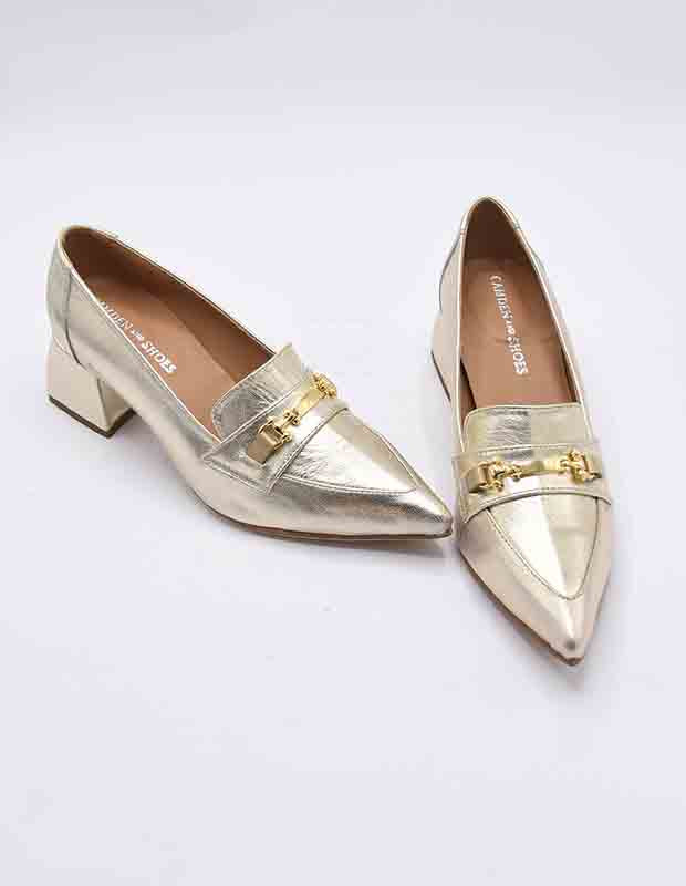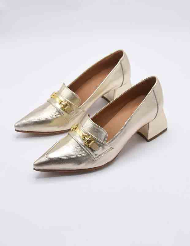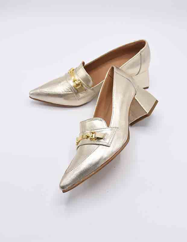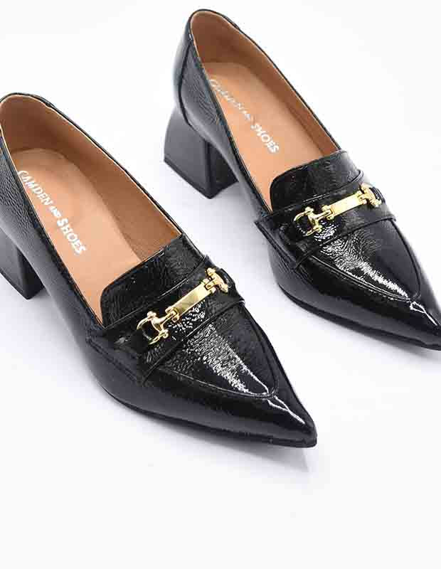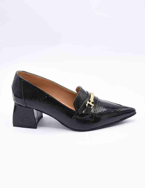 נעל עקב מחודדת שמשלבת אלגנטיות ונוכחות עם נוחות יומיומית. עשויה עור לכה איכותי במרקם מבריק ומוקפד, עם גימור מתכתי מוזהב בחזית שמוסיף טאצ' יוקרתי ומודרני.