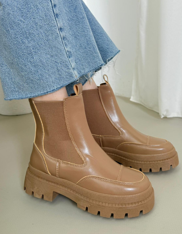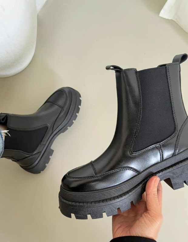 מגפון צ'לסי בעיצוב עכשווי ונקי, עשוי חומר דמוי עור יוקרתי בגימור מבריק עם שילובי אלסטיק צדדי למראה אלגנטי ונוחות מרבית.